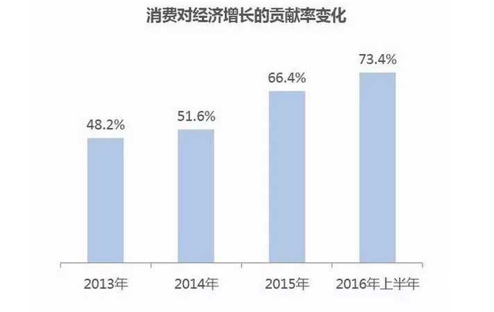 從 宏觀大環(huán)境來(lái)看,2016 年國(guó)民經(jīng)濟(jì)延續(xù) 2015 年的zhongg速增長(zhǎng),GDP 增速難以逾越 7% 大關(guān)。與此同時(shí),消費(fèi)占經(jīng)濟(jì)增長(zhǎng)的比率逐年提升,2016 年上半年達(dá)到 73.4%,成為經(jīng)濟(jì)增長(zhǎng)的重要引擎。在經(jīng)濟(jì)進(jìn)入zhongg速增長(zhǎng)的新常態(tài)下,供給側(cè)改革創(chuàng)新與居民消費(fèi)升幾的趨勢(shì)顯現(xiàn)。